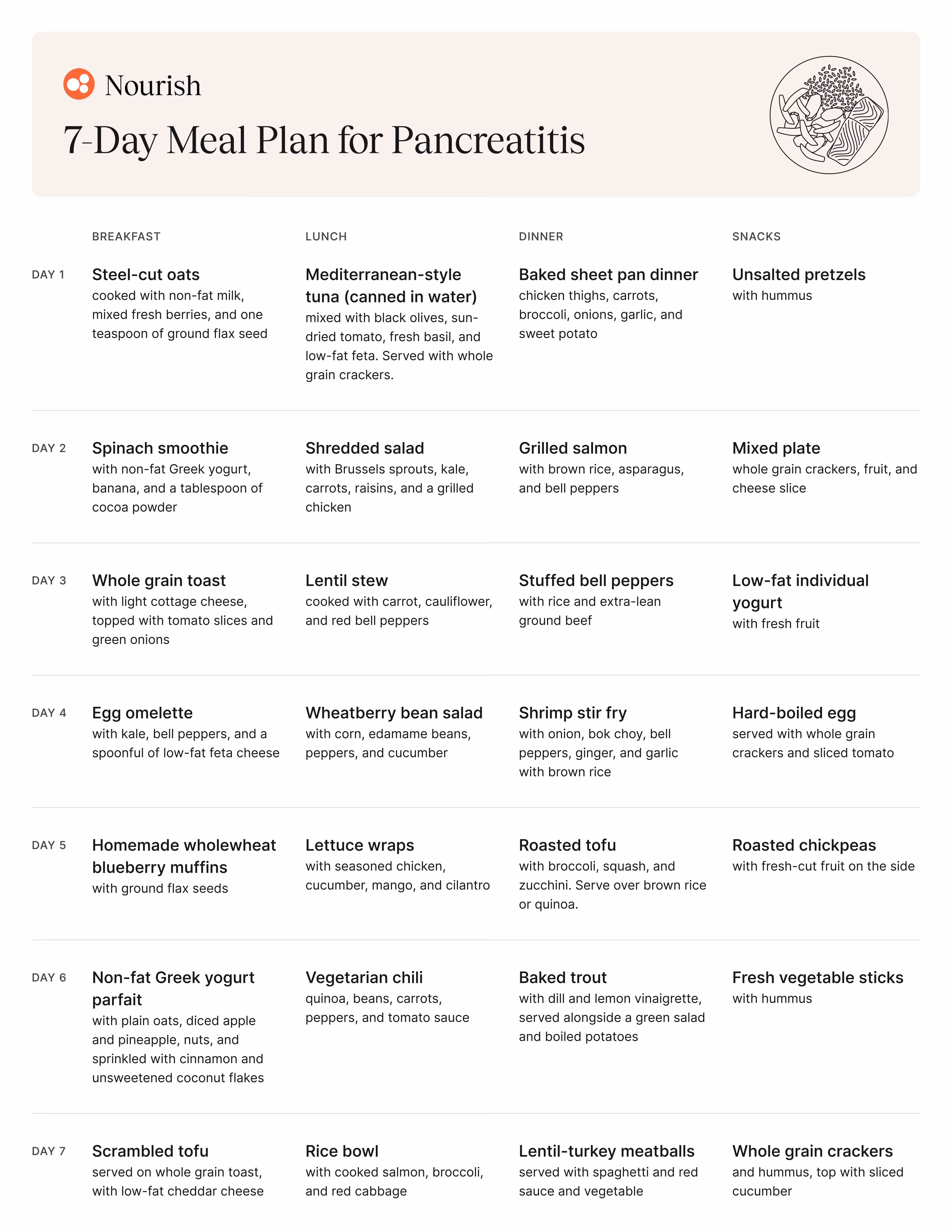 Below is an example of a 7-day meal plan for pancreatitis. The portion sizes will vary depending on your nutritional requirements.